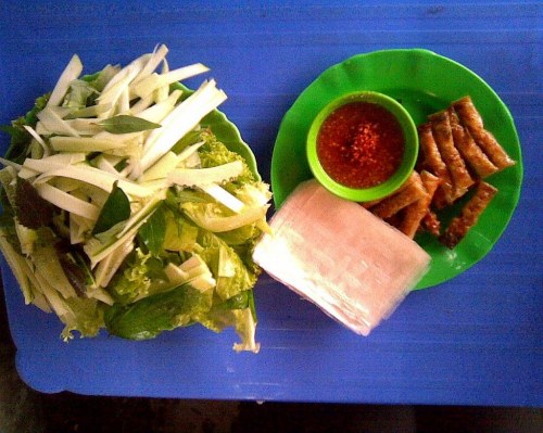 Màu trắng của bánh tráng mỏng, gam xanh của rau, quả, màu cam của nước mắm, đỏ vàng của những cuốn chả, hòa trộn vào nhau tạo nên một món bánh tuyệt cú mèo. Đan hai que chả vào nhau,một tay giữ tay kia dùng sức tuốt những miếng chả nhỏ ra dĩa cách cuốn bánh cũng giống như cách người ta ăn chả cuốn vậy. Lấy miếng bánh tráng được cắt làm tư bày trên dĩa cho cuốn chả lụi nhỏ vào, cho chút rau sống, đôi ba miếng dưa leo hoặc xoài sống tùy vào khẩu vị từng người. Cuốn chặt, vừa miệng chấm với nước mắm đậu phộng thì khỏi chê.