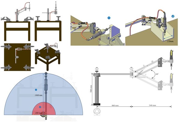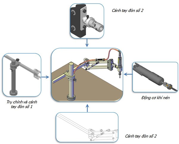 • Giải pháp sử dụng hai cánh tay đòn và các cơ cấu khớp xoay, nhằm mở rộng phạm vi làm việc của máy.Nhờ kết hợp hai cánh tay đòn, máy có khả năng làm việc trong bán kính 1000 mm.