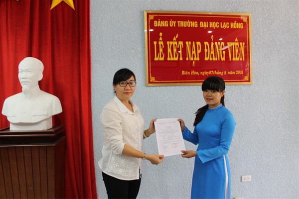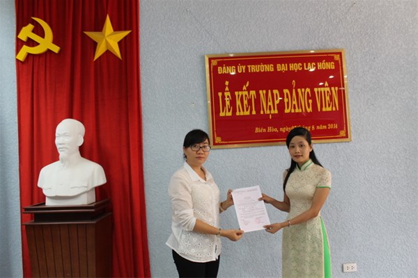 Được sự thống nhất của Ban thường vụ Đảng ủy khối, Đảng ủy trường đại học Lạc Hồng, vào lúc 13h30 ngày 07 tháng 08 năm 2014 tại phòng họp cơ sở 1, Chi bộ 7 đã tiến hành tổ chức lễ kết nạp Đảng viên cho 02 quần chúng xuất sắc Phan Thị Hời và Trần Thị Út Nữ vào Đảng Cộng sản Việt Nam; Đến dự buổi lễ có Đ/c Nguyễn Trùng Phương – Bí thư Đảng ủy trường, Đ/c Lê Sơn Quang – Bí thư Đoàn trường cùng toàn thể Đảng viên trong Chi bộ 7.