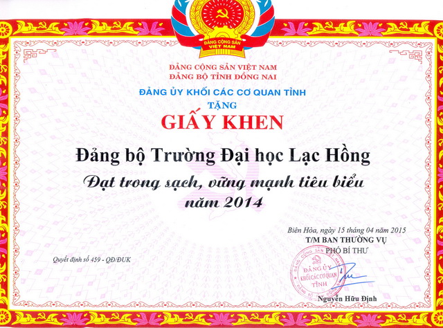Ngày 26/5/2015, tại buổi làm việc thứ hai của Đảng bộ trường Đại học Lạc Hồng lần thứ V, nhiệm kỳ 2015 – 2020 diễn ra tại cơ sở 1, Đại học Lạc Hồng. Đảng bộ trường đã tôn vinh 02 chi bộ đạt "Trong sạch, vững mạnh tiêu biểu" và cá nhân đảng viên hoàn thành xuất sắc nhiệm vụ trong năm 2014. Dự buổi tuyên dương có Đ/c Hà Quang Vượng  Ủy viên thường vụ, Trưởng ban Tổ chức Đảng ủy khối, Đ/c Nguyễn Trùng Phương – Bí thư Đảng bộ nhà trường; Đ/c Đỗ Hữu Tài – Phó Bí thư Đảng bộ, Hiệu trưởng nhà trường; các đ/c trong BCH Đảng bộ trường; Bí thư các chi bộ và đảng viên trong toàn Đảng bộ cũng có mặt trong buổi lễ tuyên dương.