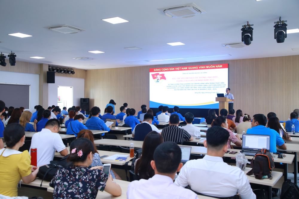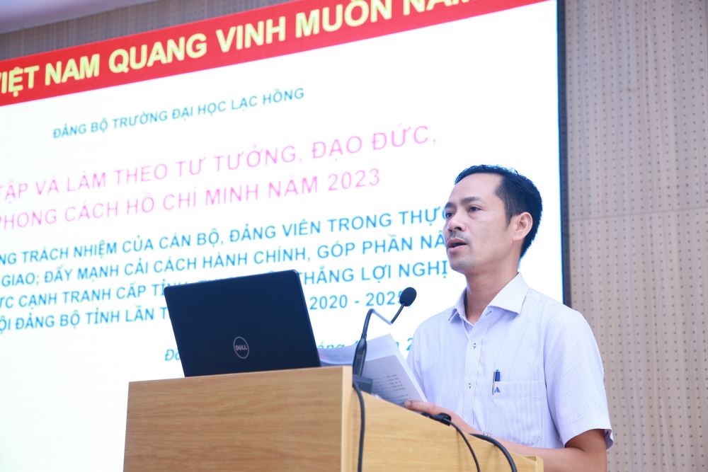 Sáng ngày 08/4/2023 tại phòng A301, Cơ sở 1, Đảng ủy Trường Đại học Lạc Hồng đã tổ chức Hội nghị học tập, quán triệt và triển khai chuyên đề năm 2023 “Học tập và làm theo tư tưởng, đạo đức, phong cách Hồ Chí Minh về tăng cường trách nhiệm của cán bộ, đảng viên trong thực hiện nhiệm vụ được giao; đẩy mạnh cải cách hành chính, góp phần nâng cao chỉ số năng lực cạnh tranh cấp tỉnh, thực hiện thắng lợi Nghị quyết Đại hội Đảng bộ tỉnh lần thứ XI, nhiệm kỳ 2020 – 2025 (Chuyên đề học tập và làm theo tư tưởng, đạo đức, phong cách Hồ Chí Minh năm 2023 của Đảng bộ tỉnh Đồng Nai)