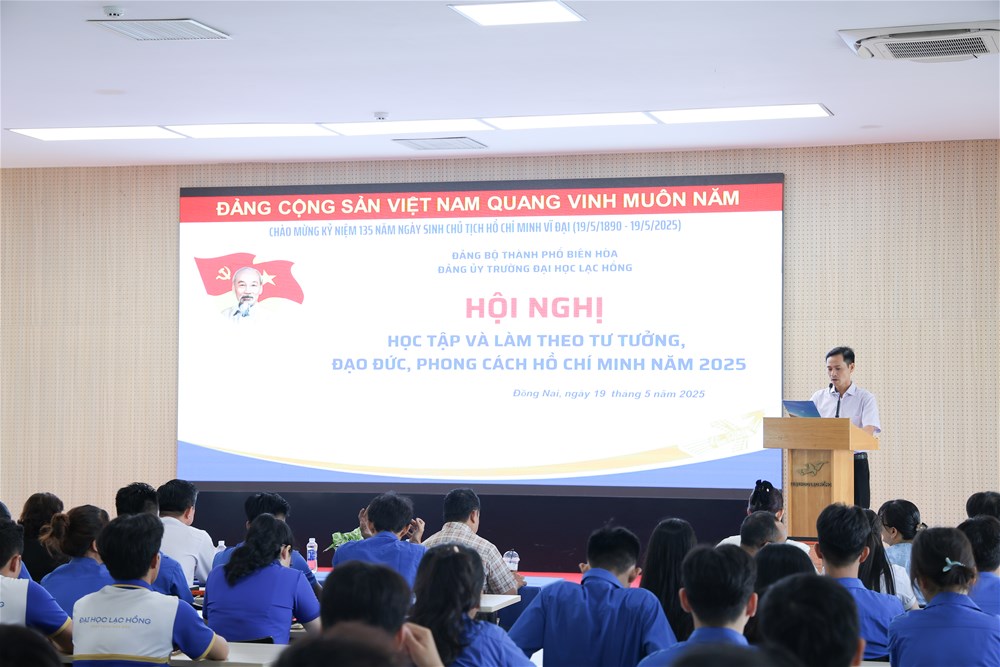 Chào mừng kỷ niệm 135 năm Ngày sinh Chủ tịch Hồ Chí Minh (19/5/1890 - 19/5/2025), sáng ngày 19/5/2025 tại Hội trường A301, Cơ sở 1, Đảng ủy Trường Đại học Lạc Hồng đã tổ chức Hội nghị học tập và triển khai thực hiện Chuyên đề năm 2025 “Học tập và làm theo tư tưởng, đạo đức, phong cách Hồ Chí Minh về phát triển kinh tế gắn liền với đảm bảo an sinh xã hội, nâng cao đời sống Nhân dân".