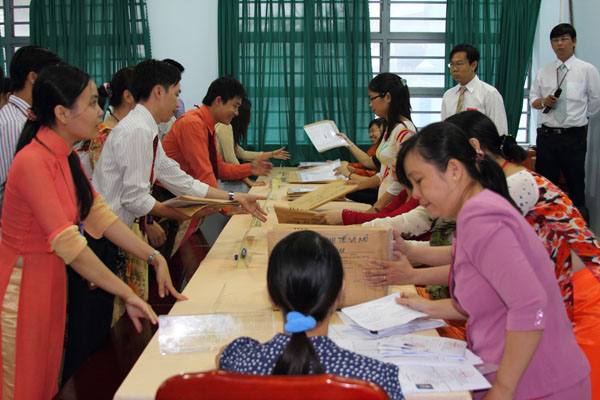 Các giám thị 1 lên nhận túi bài thi và kiểm tra những giấy tờ cần thiết trong túi bài thi