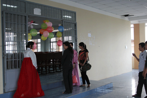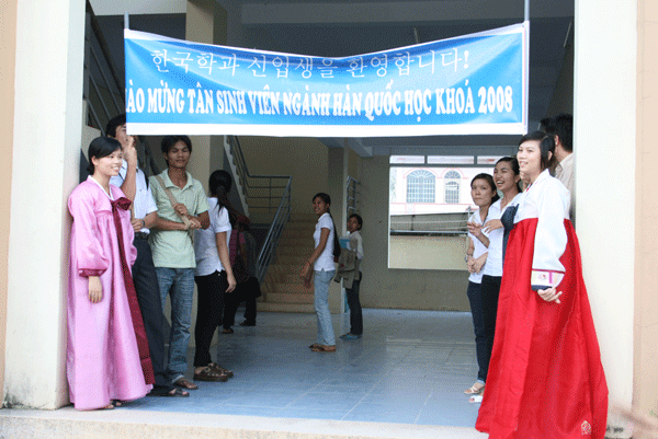 Ngay từ cổng vào đã diễn ra cảnh đón tiếp đặc trưng của ngành Hàn Quốc học với 2 bạn sinh viên mặc trang phục truyền thống của Hàn Quốc rất dễ thương và băng rôn chào mừng tân sinh viên bằng tiếng Hàn.