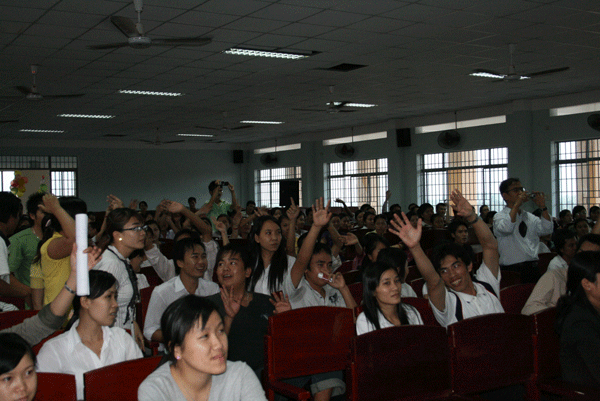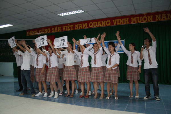 Sinh viên lớp 05DPH1 chào đón tân sinh viên.
