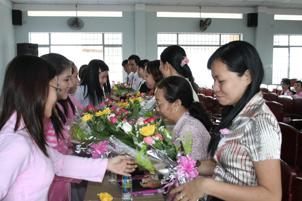 Sinh viên tặng hoa cho các thầy cô đến tham dự buổi lễ của Khoa.
