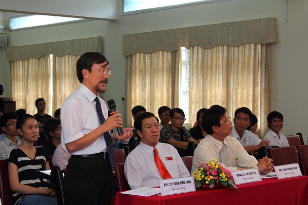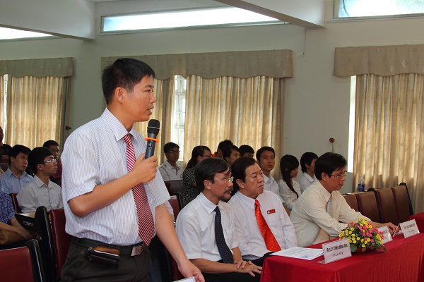 Tiếp theo đó, ThS. Lâm Thành Hiển đã trả lời cho câu hỏi về điểm xét tuyển nguyện vọng mà nhiều thí sinh quan tâm: “Ở nguyện vọng 1 với chỉ tiêu 2.400 sinh viên, sau khi có kết quả điểm sàn của Bộ GD&ĐT đây cũng là điểm chuẩn của trường: Khối A, A1 – 13 điểm; Khối B, C – 14 điểm; Khối D1 – 13.5; riêng Ngành Dược được xét tuyển cao hơn mức điểm sàn (Khối A – 16 điểm và Khối B – 17 điểm). Sau đó nhà trường sẽ xét tuyển nguyện vọng bổ sung đối với thí sinh có điểm thi bằng mức điểm sàn trở lên. Riêng Ngành Dược thì xét tuyển khối A là 16 và khối B là 17 điểm trở lên. Mỗi đợt xét tuyển cách nhau 20 ngày và dự kiến sau khi kết thúc đợt 1 vào ngày 10/09 sẽ xét tuyển nguyện vọng tiếp theo. Ngoài ra nhà trường còn xét tuyển hệ Cao đẳng nghề gồm 7 ngành: Công nghệ Thông tin, Điện Công nghiệp, Cơ Điện tử, Kỹ thuật Xây dựng, Quản trị Doanh nghiệp vừa và nhỏ, Kế toán Doanh nghiệp, Phiên dịch tiếng Anh thương mại. Đối tượng xét tuyển là thí sinh tốt nghiệp 12 và thí sinh có điểm thi dưới mức sàn cao đẳng.”
