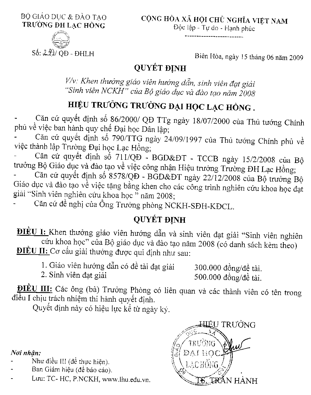 Bộ Giáo dục và đào tạo khen thưởng sinh viên Lạc Hồng đạt giải thưởng "Sinh viên NCKH" năm 2008