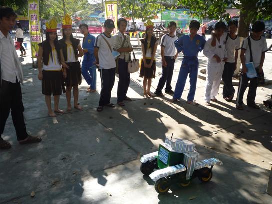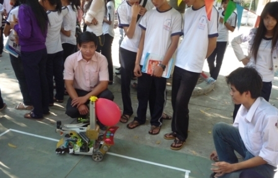 Các em học sinh theo dõi và tập điều khiển robot