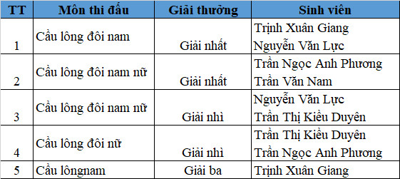 Trải qua hơn bốn tuần thi đấu, hội thao đã diễn ra thành công tốt đẹp. Các vận động viên khoa đã cống hiến cho các cổ động viên những hình ảnh đẹp mắt có tính chuyên môn cao, sự nhiệt huyết, sáng tạo và khát vọng vươn lên của tuổi trẻ. Khoa KTCT vinh danh và chúc mừng các em đạt giải ở Hội thao lần này, với các giải thưởng đạt được như sau: