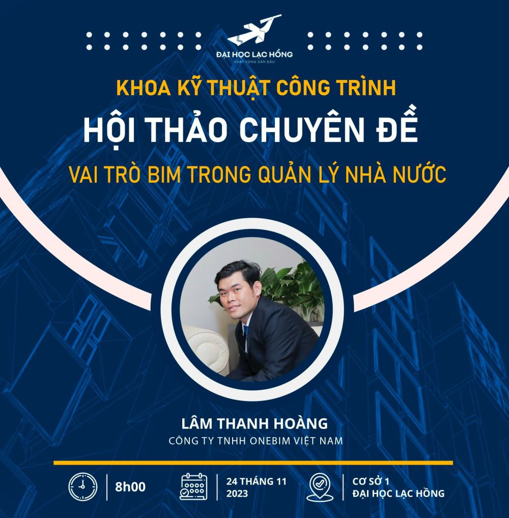 Nằm trong chuỗi hoạt động hằng năm của Khoa Kỹ thuật công trình. Giúp cho công tác đào tạo của Khoa, gắn liền học tập với yêu cầu của doanh nghiệp theo nhu cầu của xã hội. Khoa Kỹ thuật công trình tổ chức Hội thảo “Vai trò BIM trong quản lý nhà nước” vào lúc 08h00, ngày 24/11/2023 với nội dung sau: