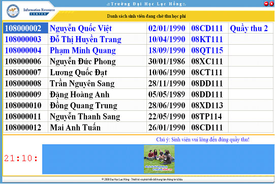 + Sau khi đăng ký thì sinh viên chỉ ngồi đợi tên mình được đọc lên(quá trình này hoàn toàn tự động) và nhìn lên màn hình hiển thị xem mình được thu ở quầy thu nào(vì có nhiều quầy thu) sau đó tới quầy thu đó là xong.