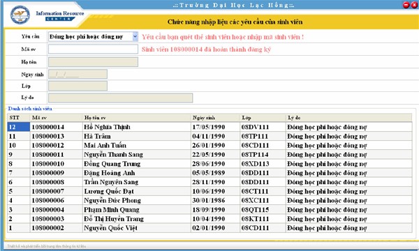 + Khi sinh viên muốn đóng học phí thì sẽ tiến hành đang ký để được sếp vào hàng đợi, ai đăng ký trước thì sẽ được thu trước, quá trình đăng ký tốn rất ít thời gian vì thay cho việc ghi giấy thì sinh viên chỉ mang theo thẻ sinh viên và quét qua máy đọc mã vạch là xem như quá trình đăng ký hoàn tất.