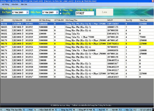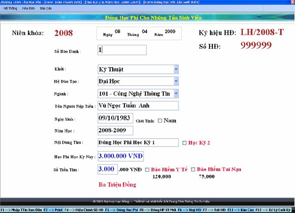 + Đi kèm với chức năng thu và in hóa đơn thì module này cũng cho biết SV này đã đóng hay chưa đóng học phí học kỳ này, còn nợ hay không còn nợ.