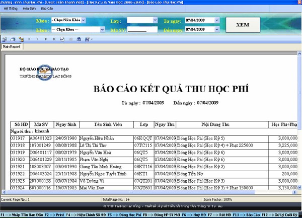 Cho phép xuất các báo cáo về tình hình thu học phí hay thu bảo hiểm của từng sv, từng lớp, từng khoa.