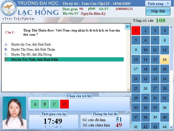·        Có thể lựa chọn câu hỏi 01 cách dễ dàng, thuận lợi trong quá trình làm bài thi