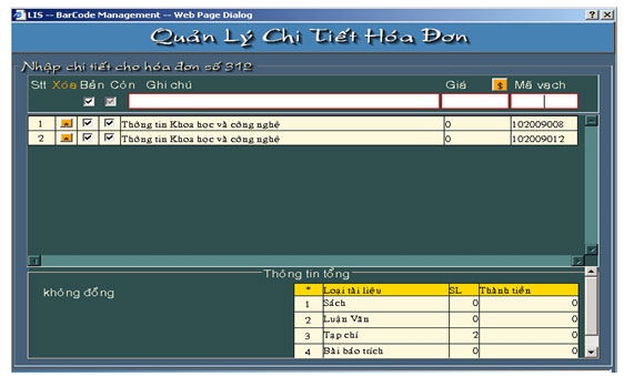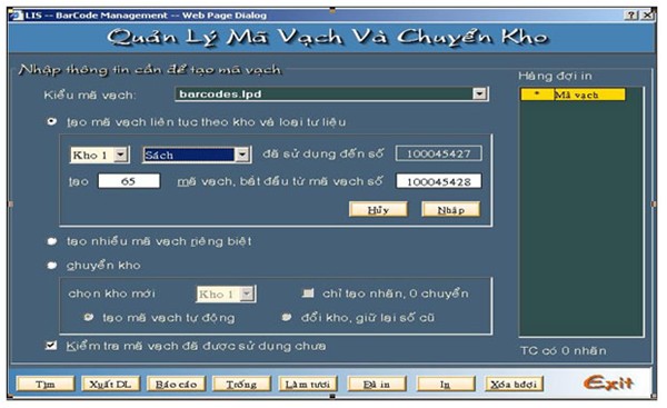 ü      Thiết lập mã vạch tự động cho sách và các tài liệu khác trong thư viện phù hợp với kho chứa sách. Đồng thời in mã vạch để dán vô sách hay tài liệu.