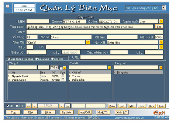 ü      Cập nhật biên mục của từng quyển sách hay tài liệu.