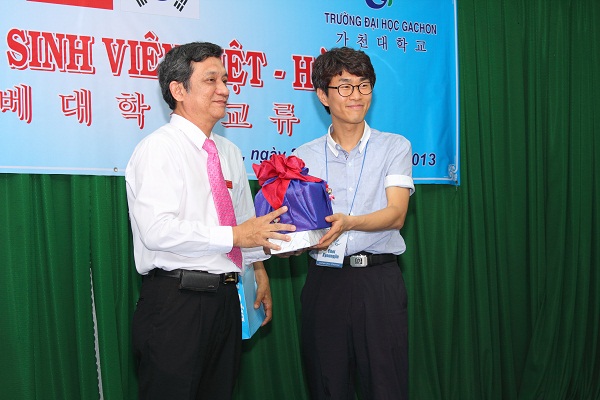Assoc. Prof. Kyoung Jin (right) on behalf of Gachon University presents a gift to Vice Rector of LHU Dr. Nguyen Van Nam.