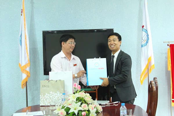 Vice Rector Lam Thanh Hien presented souvenir gift to Mr. Daehwan Moon (right side).