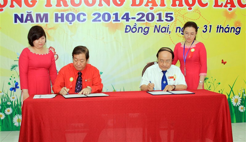 Mr. Do Huu Tai (left) and Mr. Diep Cam Thu implemented the signing of Collective Agreement of the academic year 2014 - 2015.