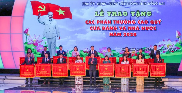 Representing LHU, Vice Rector Nguyen Vu Quynh - of Lac Hong University (left) honored to receive the Government's Emulation Flag