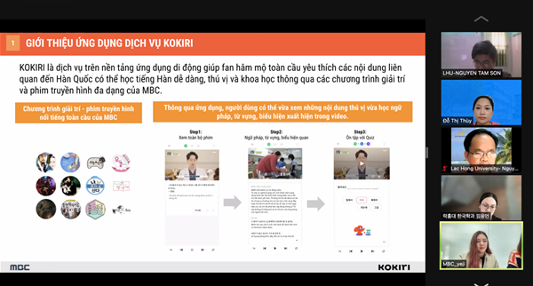 The working session focused on KOKIRI - Korean language learning application and the cooperation agreements between MBC and LHU. Accordingly, after signing the MOU, KOKIRI will provide free services for students and lecturers of the Korean Studies Department (equivalent to 20 USD/person/month) and prioritize opportunities for students to participate in projects and KOKIRI service promotion programs. LHU will support KOKIRI to improve service quality through user interviews and service promotion for current students (giving coupons to students other than Korean Studies).