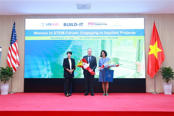 At the Forum, Dr. Lopa BaSu, Senior HIV & TB Advisor at USAID Vietnam shared the playbook "Women in STEM" as a collaborative effort between ASU and its six strategic partner universities. Through this playbook, BUILD-IT's strategic partner universities have access to a tested and proven manual for educators to assure that women benefit from projects that are practically applied in Hanoi, Can Tho, Da Nang, Dong Nai and HCM City. It is a starting point to inspire gender-responsive programming, mitigate gender barriers, and promote equitable learning outcomes during applied projects.