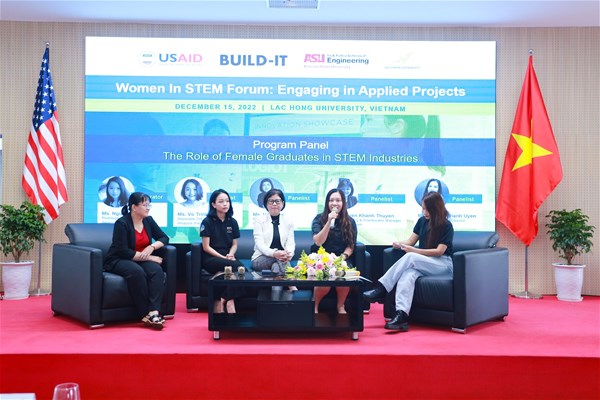 The Forum agenda also included the panel session "Enrolling, Supporting & Graduating Women in STEM" including Moderator Ms. Dang Tran Phuong Anh, Country Director, ASU Vietnam and Panelists namely Assoc. Prof. Dr. Dam Sao Mai, Vice Rector, Industrial University of HCM City; Dr. Bui Thi Ngan, Deputy Director, Board of Project Management, Ha Noi University of Industry and Assoc. Prof. Dr. Bui Hoai Thang, Head of Academic Affairs Office, HCM City of Technology. Here, the participants listened to experts in the field on how to enroll, support and graduate more women in STEM as well as their strategies to engage and provide more opportunities for women to succeed in these fields.