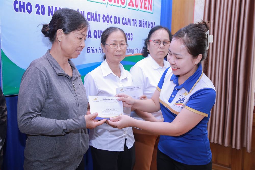 On behalf of LHU and the family of Ms. Do Thi Lan Dai - Chairwoman of the University Council, Ms. Truong Le Bao Trinh - Secretary of Youth Union on November 15, 2023 presented gifts and subsidies Quarter II and III/2023 to 20 AO/dioxin victims in Bien Hoa city, Dong Nai province. The total value of gifts and subsidies was worth VND 48 million.