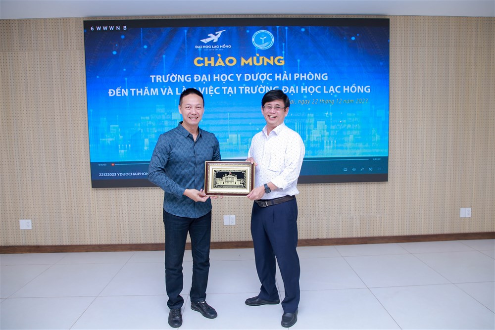 Dr. Lam Thanh Hien giving souvenirs to the representative of Hai Phong University of Medicine and Pharmacy