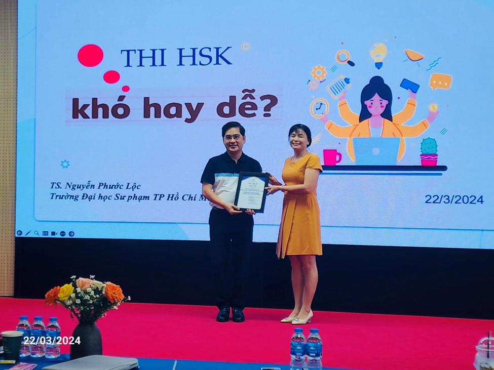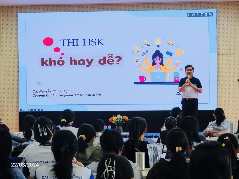 On March 22, 2024, at Hall A301, Campus 1, LHU, the Department of Chinese Language under the Faculty of Oriental Studies organized a talkshow "Is the HSK exam easy or difficult?" with the presentation of speaker Nguyen Phuoc Loc, Vice Dean of the Faculty of Chinese Language, VNU-HCMC University of Education.