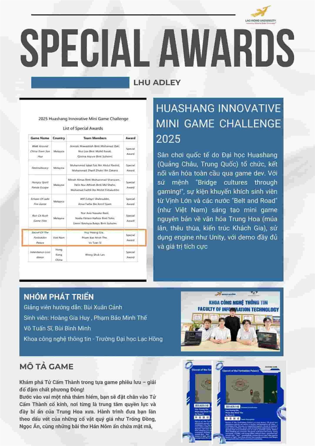 The LHU Adley team including Hoang Gia Huy, Pham Bao Minh The, Bui Binh Minh, Vo Tuan Si, under the guidance of their mentor, Bui Xuan Canh from the Faculty of Information Technology, made history at the Huashang Innovative Mini Game Challenge 2025 by winning the Special Award. Earlier, LHU Adley was the only Vietnamese team to reach the Top 5.