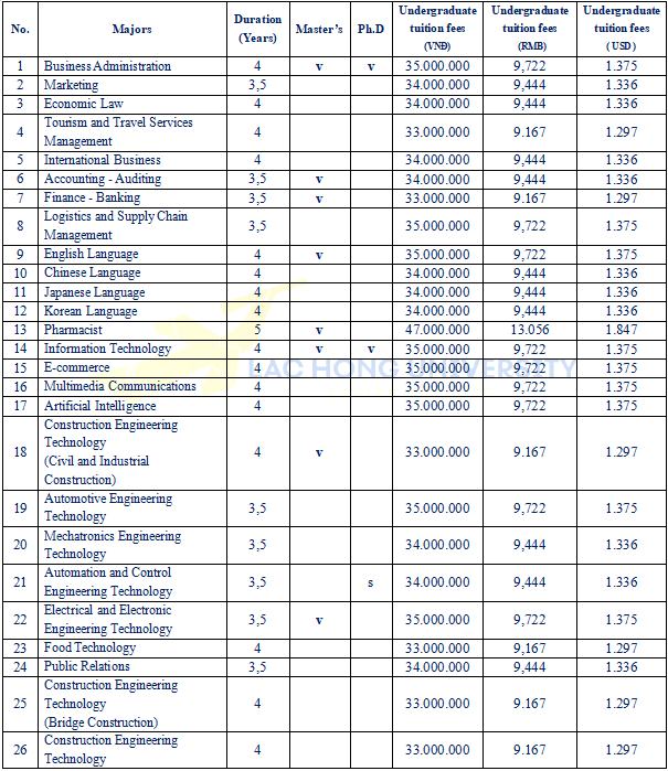 With a high school diploma and transcript, international students can choose to study any undergraduate majors at the university after completing a 1-year Vietnamese language training program organized by LHU. After graduating, you can obtain a bachelor's degree. (For details on the Vietnamese language training program, please refer to Section 2 of this document)