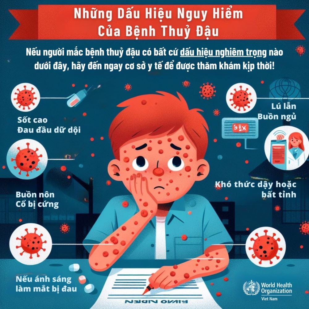 🆘 Hãy đến ngay cơ sở y tế để được thăm khám kịp thời nếu như người mắc thuỷ đậu có các dấu hiệu nghiêm trọng sau: sốt cao, đau đầu dữ dội, mắt bị đau dưới tác động của ánh sáng, buồn nôn, cổ bị cứng, lú lẫn, co giật, buồn ngủ nhiều, khó thức dậy, hoặc bị bất tỉnh.