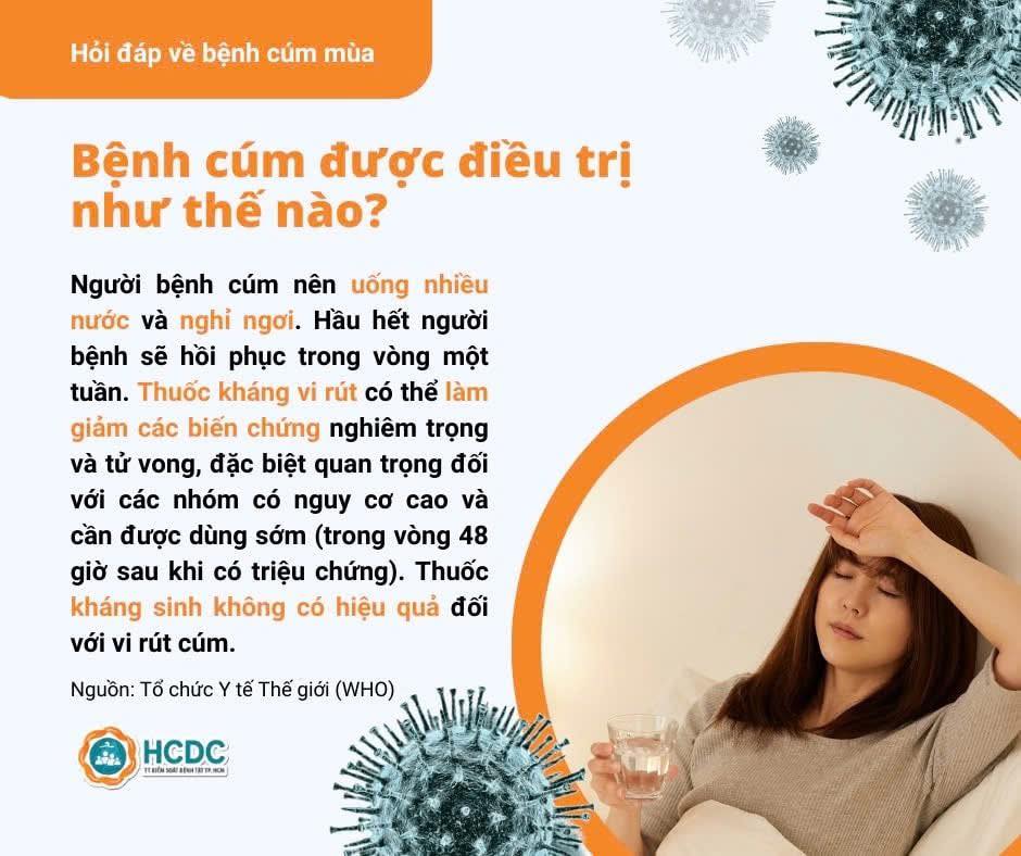 Người bệnh cúm nên uống nhiều nước và nghỉ ngơi. Hầu hết người bệnh sẽ hồi phục trong vòng một tuần. Thuốc kháng vi rút có thể làm giảm các biến chứng nghiêm trọng và tử vong, đặc biệt quan trọng đối với các nhóm có nguy cơ cao và cần được dùng sớm (trong vòng 48 giờ sau khi có triệu chứng). Thuốc kháng sinh không có hiệu quả đối với vi rút cúm.
