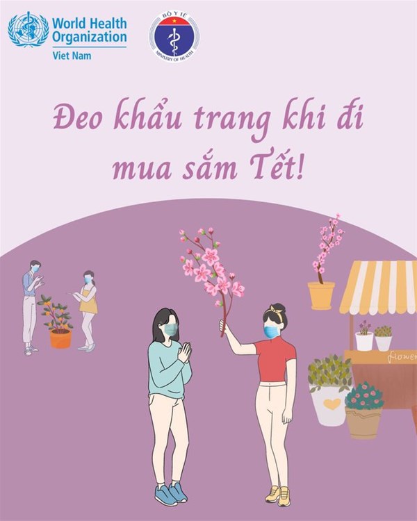 • Đeo khẩu trang ở những nơi công cộng đông người, ví dụ như chợ Tết, chợ hoa, siêu thị,…