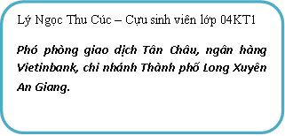 Chào các bạn sinh viên đang còn ngồi trên ghế nhà trường và các bạn chuẩn bị bước ra đường đời. Tôi tên là Lý Ngọc Thu Cúc, sinh viên lớp 04KT1. Tôi muốn chia sẻ với các bạn về bản thân từ khi ra trường và bắt đầu đi làm. Năm 2008, khi nhận được tấm bằng đại học loại Khá, tôi đã về quê hương mình và tham gia ứng tuyển vào Ngân hàng Vietinbank, tôi đã trải qua các vòng thi và cuối cùng kết quả mong đợi cũng đã đến, tôi vui mừng khi trúng tuyển vào ngân hàng Vietinbank với vị trí giao dịch viên. Sau khi nhận việc, một trang mới trong cuộc đời mình đã mở ra với nhiều mơ ước và hoài bão lớn. Nhưng đôi khi cảm giác chiến thắng này níu kéo bạn quá lâu giống như thời gian bạn vừa đỗ đại học vậy. Nhiều bạn cho rằng cái gì đến sẽ đến “ trăng đến ngày trăng tròn”. Cứ từ từ mà làm việc, rồi sẽ được tăng lương, lên chức… Khi được bước chân vào ngôi nhà Vietinbank, đối với tôi đó là cơ hội để được thử thách lớn của bản thân. Tôi không ngừng học hỏi để nâng cao trình độ chuyên môn và nghiệp vụ của mình để luôn hoàn thành tốt nhiệm vụ được giao. Tôi luôn tích lũy những kiến thức thực tế vì đây là những kiến thức bổ ích mà tôi được trải nghiệm khi làm việc, những kỹ năng ứng xử với đồng nghiệp, ứng xử với lãnh đạo. Tôi luôn ghi chép những công việc mình đã làm được và không làm được để rút ra những kinh nghiệm và hoàn thiện bản thân. Không bao giờ giới hạn bản thân trong công việc của mình mà hãy sẵn sàng hỗ trợ, giúp đỡ khi các đồng nghiệp nhờ mình vì mỗi khi được làm các công việc của đồng nghiệp tôi lại đúc kết, học hỏi được thêm kinh nghiệm cho bản thân. Bên cạnh đó, làm việc trong môi trường năng động, đầy thân thiện cùng các anh chị đồng nghiệp đã giúp tôi luôn hoàn thành tốt nghiệm vụ được giao.