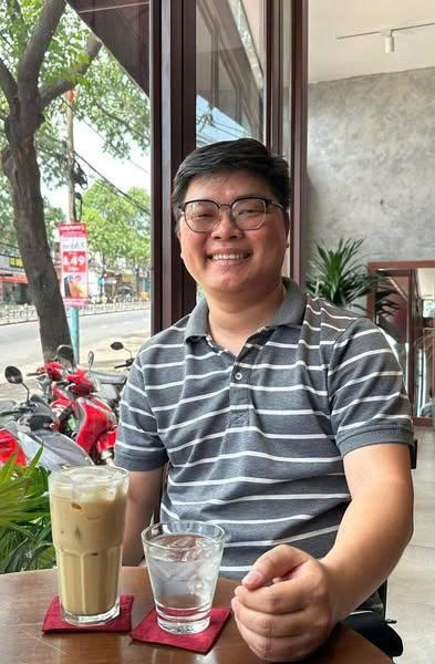 CSV Trung (bên phải) cùng thầy Trường chụp ảnh lưu niệm khi ghé thăm trường.