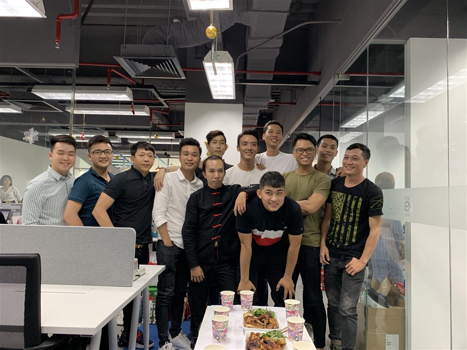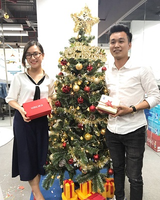 Công Đình cùng đồng nghiệp nhận quà của công ty trao tặng nhân dịp giáng sinh