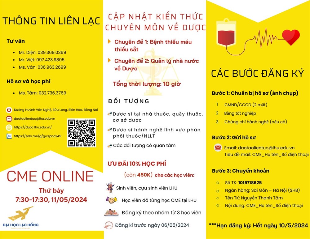 Khoa Dược đại học Lạc Hồng thông báo tuyển sinh lớp cập nhật kiến thức chuyên môn về Dược ngày 11/05/4