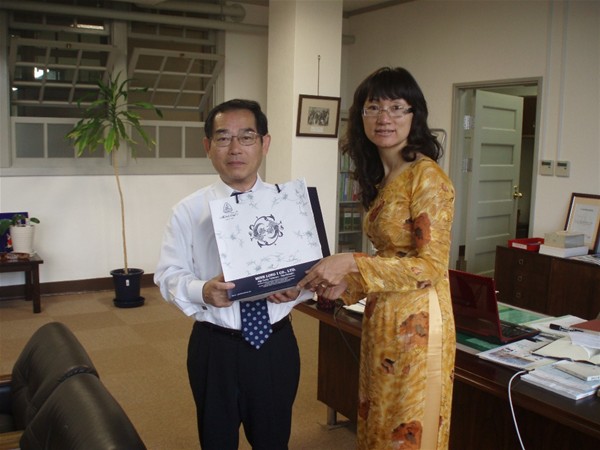Cô Đỗ Minh Hiếu gửi tặng quà lưu niệm cho thầy Hiệu trưởng trường Đại học Kwassui