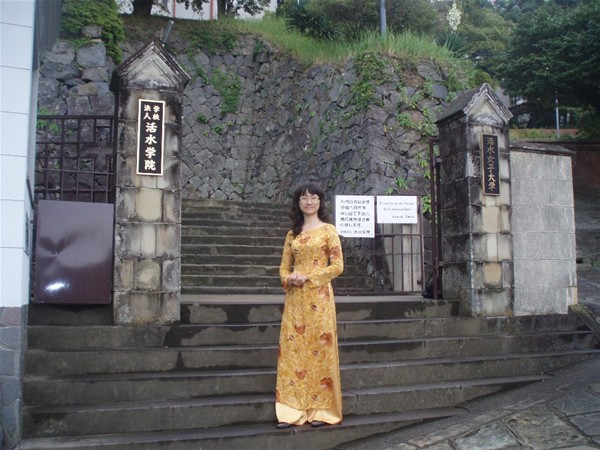 Cô Đỗ Minh Hiếu và cổng trường của trường đại học Kwassui