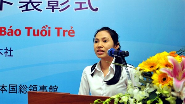 Thí sinh Hoàng Thị Láng - giải Nhì nội dung thi thơ haiku bằng tiếng Nhật - phát biểu tại buổi lễ