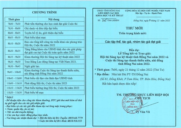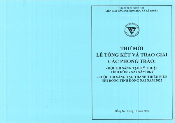 TT.NCKH&UD thông báo đến Quý Thầy/Cô và các bạn sinh viên có giải pháp đạt giải trong Hội thi Sáng tạo Kỹ Thuật Tỉnh Đồng Nai 2022.