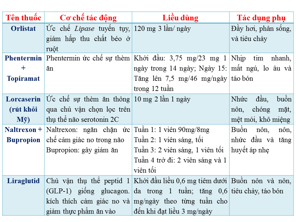 Một số thuốc điều trị béo phì được lưu hành trên thế giới: Orlistat, Phentermin + Topiramat, Lorcaserin, Naltrexon + Bupropion, Liraglutid...Trong đó, 2 thuốc được Bộ Y Tế Việt Nam phê duyệt trong điều trị béo phì là orlistat và liraglutid.