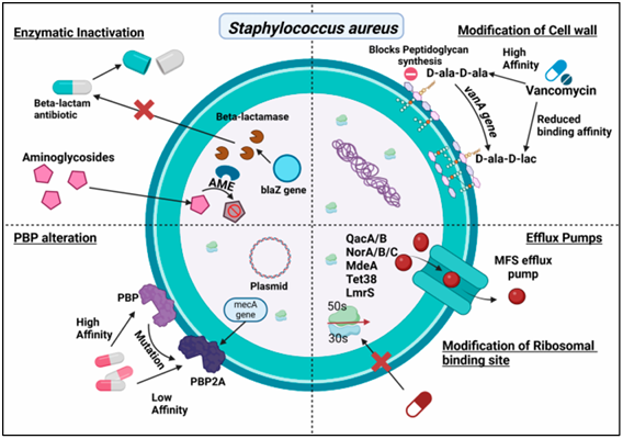 Rajput P, Nahar KS, Rahman KM. Evaluation of Antibiotic Resistance Mechanisms in Gram-Positive Bacteria. Antibiotics (Basel). 2024 Dec 8;13(12):1197. doi: 10.3390/antibiotics13121197. PMID: 39766587; PMCID: PMC11672434.