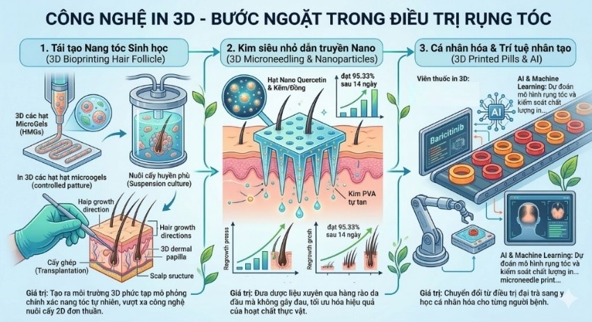Sự kết hợp giữa tác dụng của các hợp chất dược liệu tự nhiên và những đột phá công nghệ như Nano hay in sinh học 3D không chỉ mở ra chương mới trong điều trị rụng tóc, mà còn mang đến hy vọng về một giải pháp cá nhân hóa, an toàn và bền vững cho sức khỏe con người.