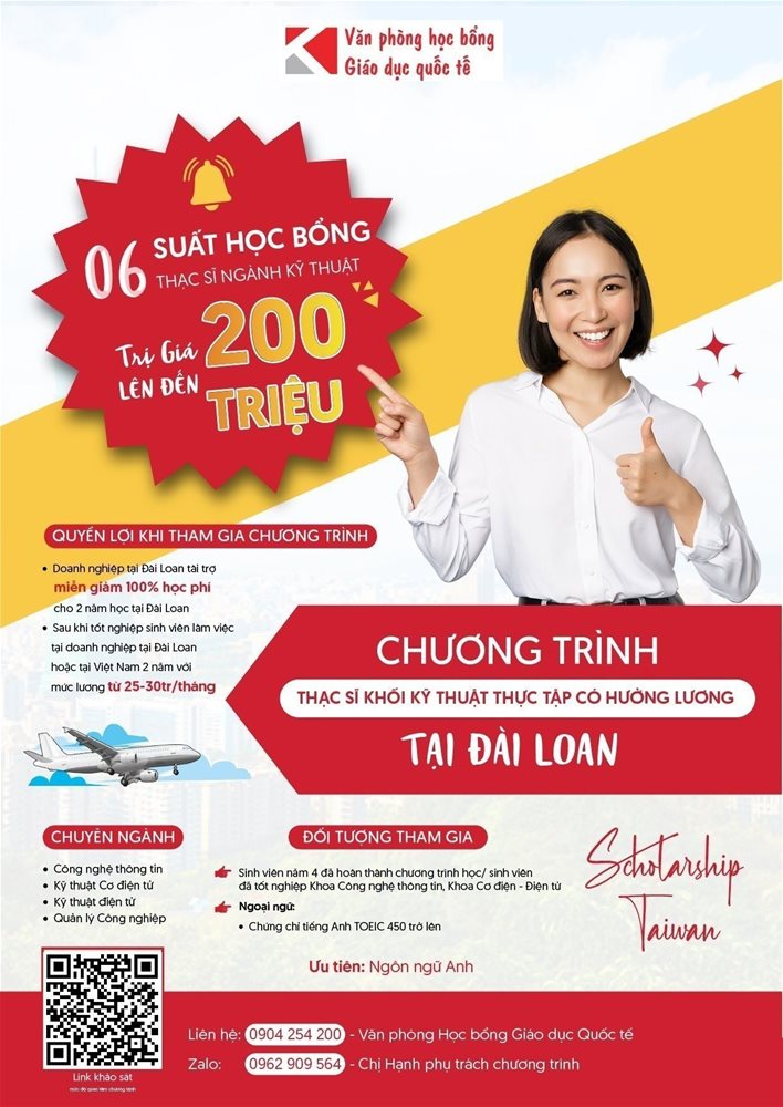 "Chương trình HỌC BỔNG THẠC SĨ KHỐI NGÀNH KỸ THUẬT có thực tập tại ĐÀI LOAN miễn giảm lên tới 100% HỌC PHÍ". HỌC VÀ TRẢI NGHIỆM TẠI DOANH NGHIỆP THỰC TẬP CÓ LƯƠNG TỪ 12-25TR/THÁNG VỪA CÓ BẰNG THẠC SĨ, VỪA CÓ THỂ TIẾT KIỆM ĐƯỢC TIỀN KHI HỌC 2 NĂM TẠI ĐÀI LOAN LÊN TỚI 150TR (Sinh viên chỉ cần đạt TOEIC 450 TRỞ LÊN là có thể đăng ký tham gia chương trình)