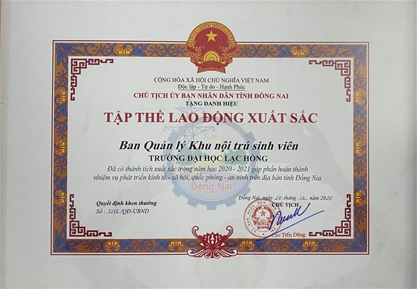 Với những thành tích nổi bật, Khu nội trú sinh viên vinh dự được UBND tỉnh Đồng Nai tặng danh hiệu Tập thể lao động xuất sắc năm học 2020 – 2021.